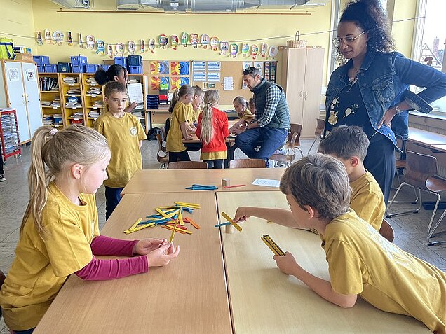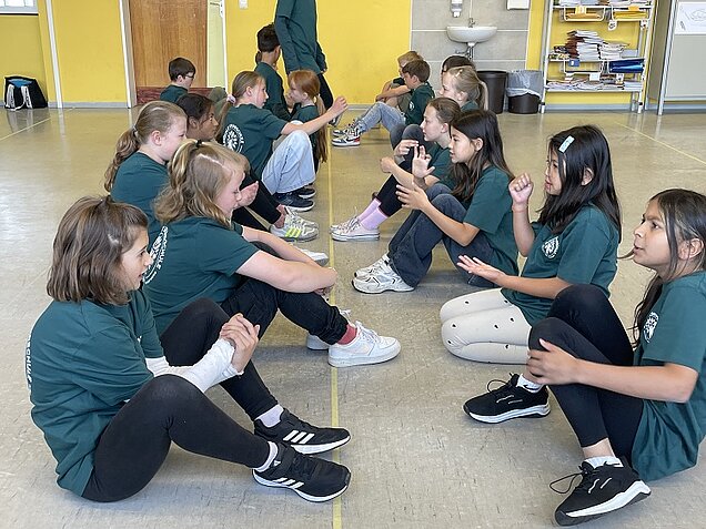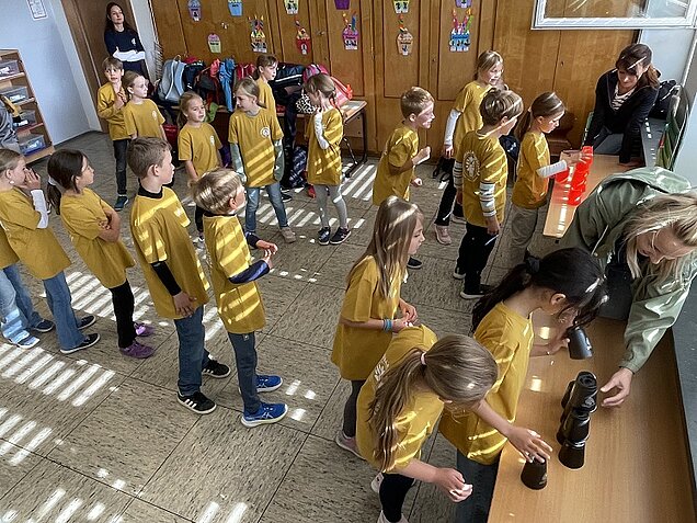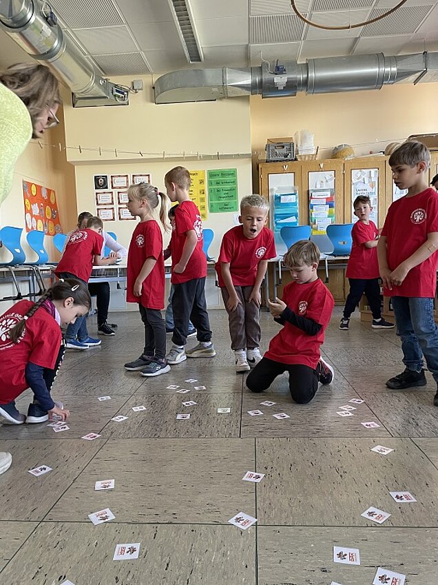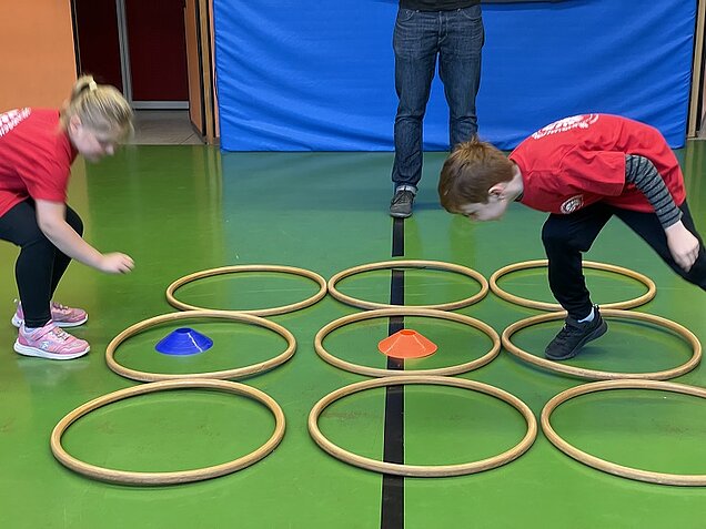 Nach der gemeinsamen Aufwärmphase, dem Raketenstart, absolvierten alle Kinder einen Parcours mit elf Stationen zu den Themenfeldern Bewegung, Ernährung, Prävention und Geschicklichkeit. Es wurden Becher oder Plättchen gestapelt, Rätsel gelöst, Memory gespielt, actionreiche Bewegungsspiele in der Turnhalle gespielt, ein gordischer Knoten gelöst und die Klassengemeinschaft gestärkt.
