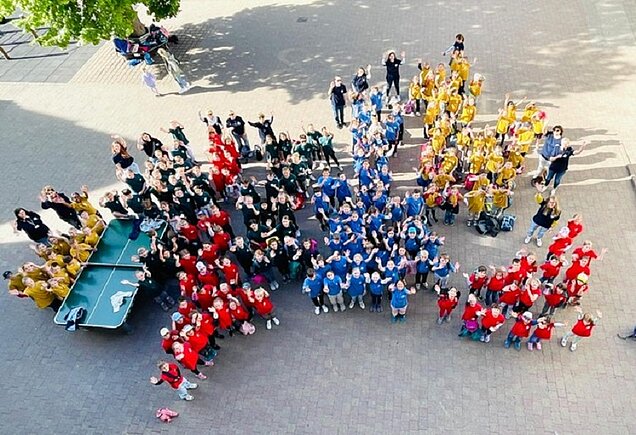 Schon früh morgens versammelten sich alle Kinder der Grundschule Deidesheim auf dem Pausenhof bei ihren Lehrerinnen. Jedes Kind erhielt zuvor ein farbiges T-Shirt mit dem neuen Schullogo. Die Erstellung des Logos und die Anschaffung der T-Shirts wurde finanziell sehr großzügig vom Förderverein der Grundschule unterstützt. Hierfür bedankt sich die Schulgemeinschaft von Herzen.