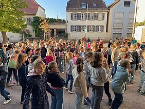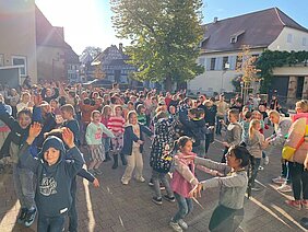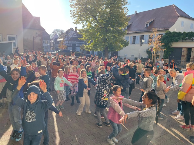 Dieses Jahr entscheiden wir uns für eine Tanz- und Musikviertelstunde. Die Schülerinnen und Schüler der Grundschule versammelten sich alle auf dem Pausenhof und unsere neue Musikbox wurde aufgebaut. Mit dem Lied „Im Popcorntopf ist der Teufel los“ startete die sportliche Einlage. Nach „Tschu Tschu Wah“ und „A-E-I-O-U“ bildete der „Körperteileblues“ den krönenden Abschluss. Alle Kinder genossen die bewegte Pause und tanzten ausgiebig mit. Im Anschluss wurde direkt gefragt, wann man die Bewegungspause wiederholen könne.