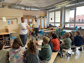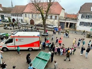 Der Ortsverein Deidesheim kam an diesem Tag mit neun Helferinnen und Helfern in die Schule. Schon morgens war die Aufregung groß, wie zu den Personen auch drei Fahrzeuge auf den Pausenhof fuhren. Schnell waren alle Schülerinnen und Schüler an den Fenstern, um zu schauen, was vor sich geht.