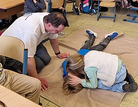 Alle Kinder lernten in verschiedenem Umfang, wie man einen Notruf absetzt und wie man betroffene Personen im Falle eines Unfalls ansprechen kann. Wenn diese allerdings nicht ansprechbar waren, wurde den Schülerinnen und Schülern vermittelt, wie man die Atmung kontrolliert und den Kopf dabei überstreckt. Außerdem übten alle die Stabile Seitenlage, um bewusstlosen Menschen helfen zu können.