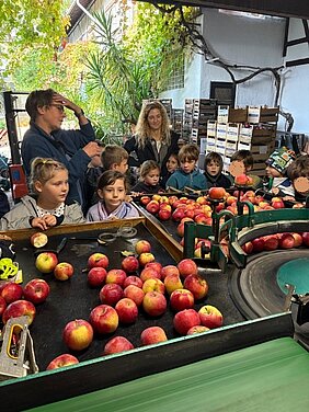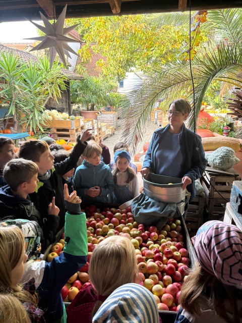 Auf dem Hof angekommen, staunten die Schülerinnen und Schüler über den liebevoll gestalteten Innenhof mit seinen bunten Kürbissen und den vielen verschiedenen Apfelsorten. Besonders spannend war der Blick hinter die Kulissen: Die Kinder durften selbst den Ernteeimer füllen und beobachten, wie die Sortiermaschine die Früchte nach der Größe ordnet.